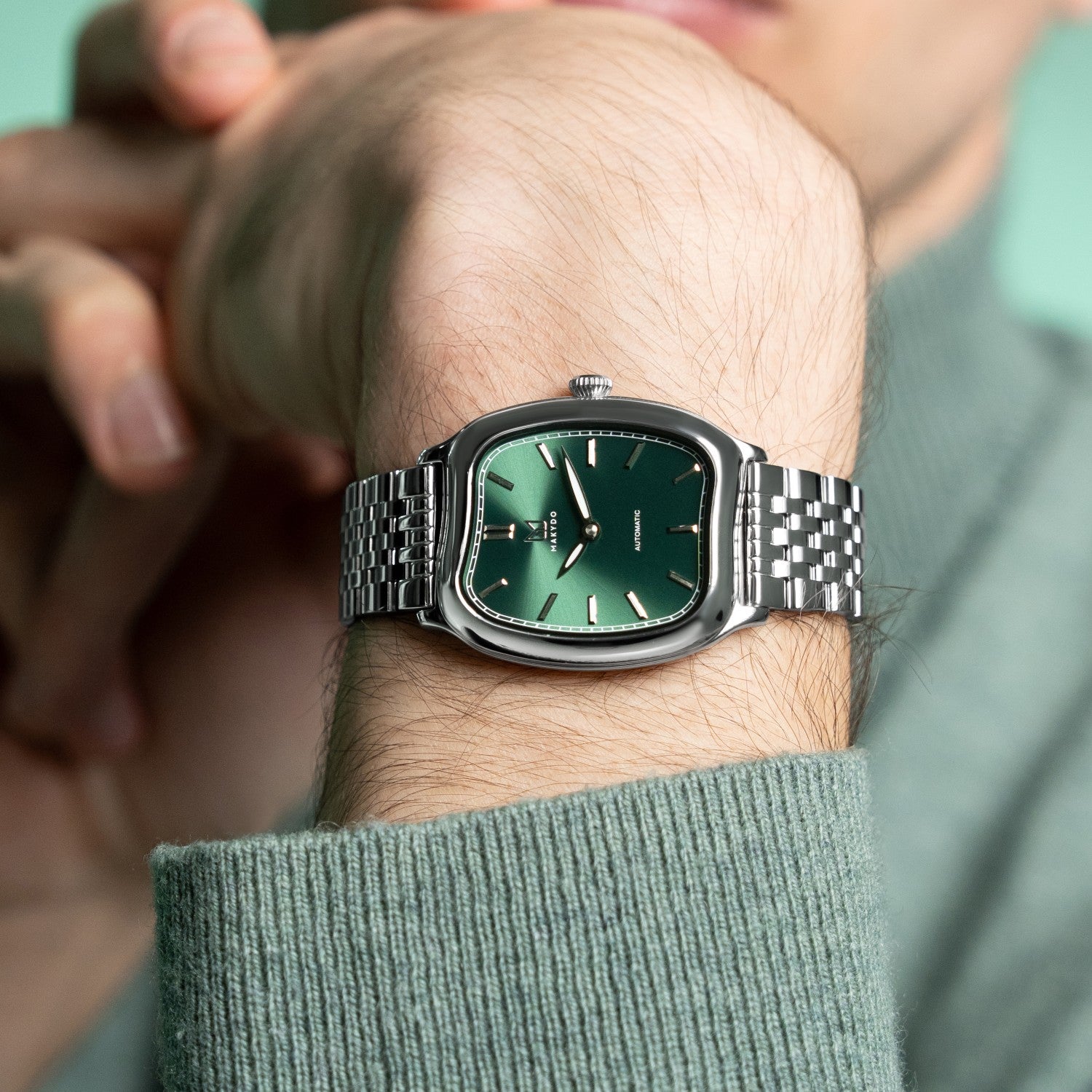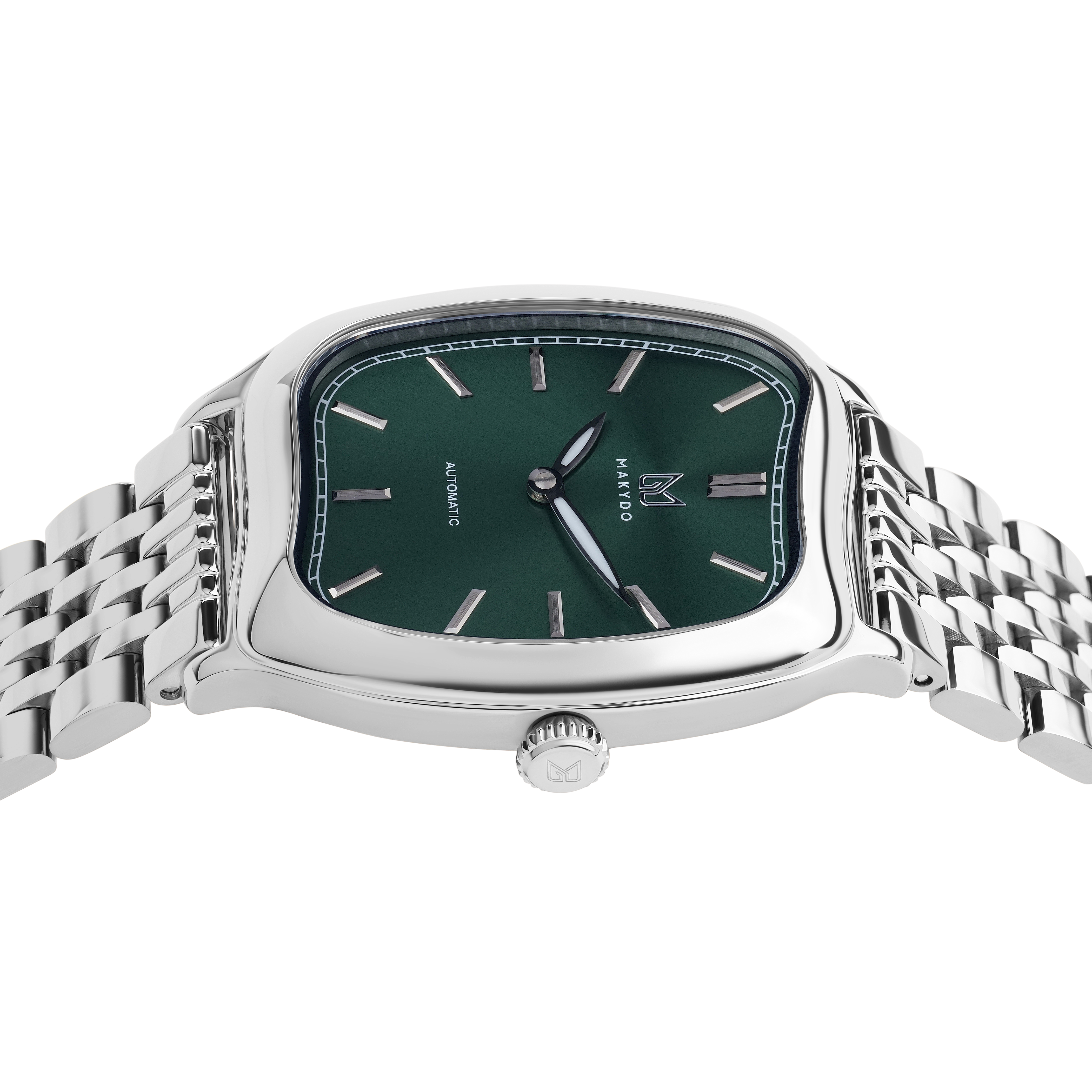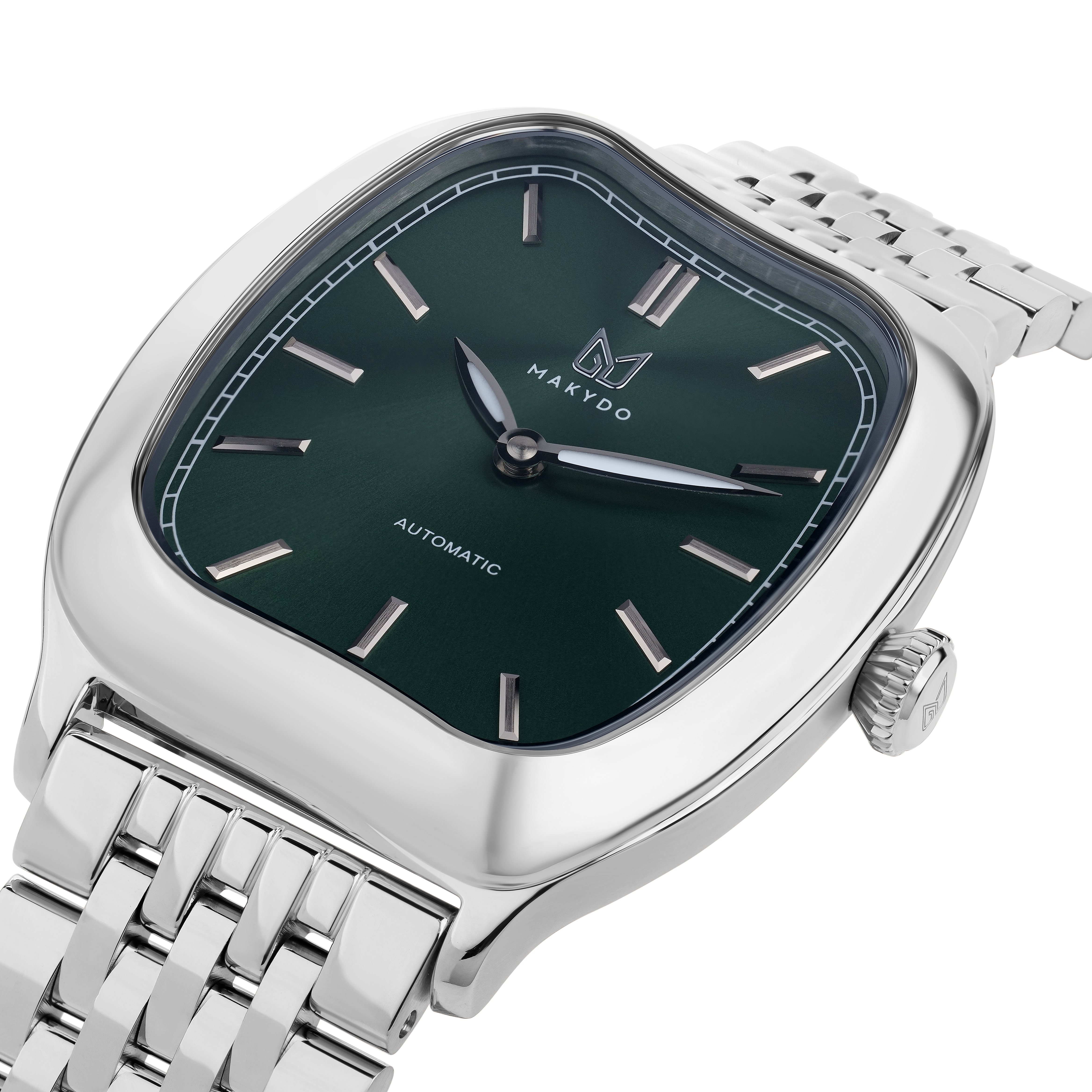 This green dial automatic watch features a rich green sunburst dial that radiates from the centre, shifting with light and movement. Paired with a minimalist two-hand display and the sculptural CONTOUR case, VERDANT captures nature in its most refined form — calm, composed, and alive.