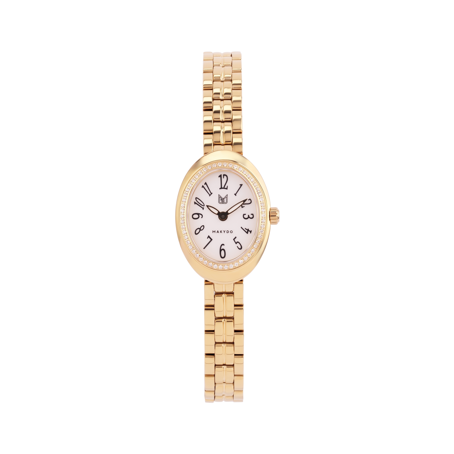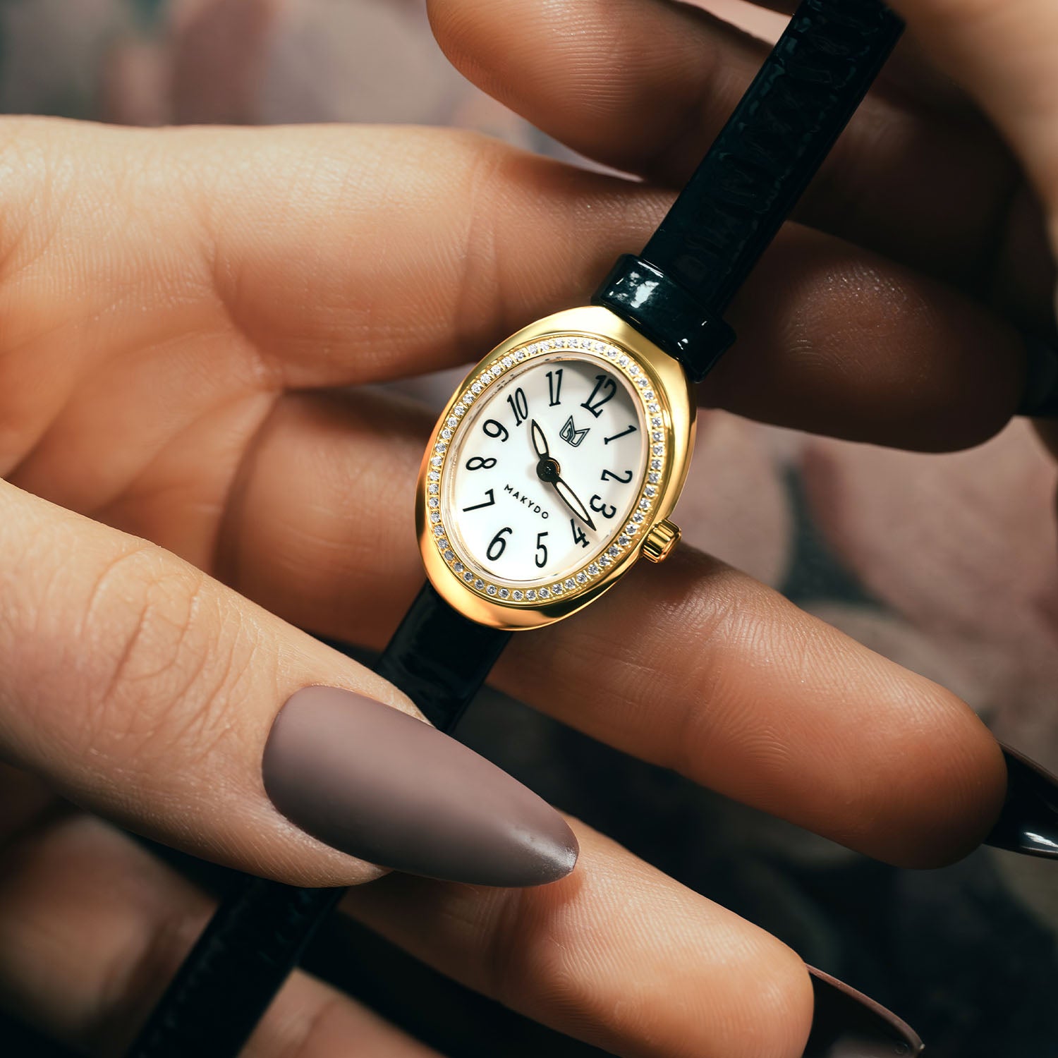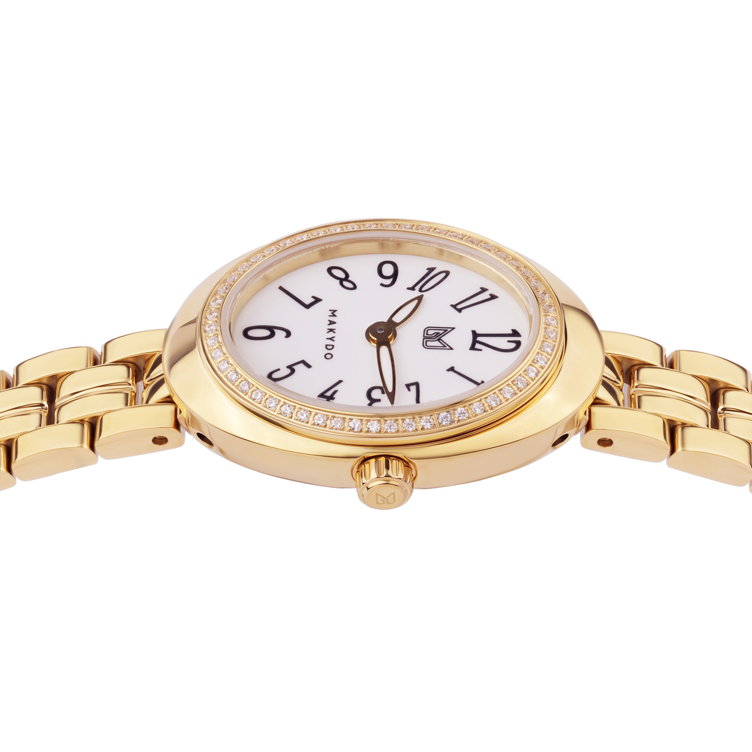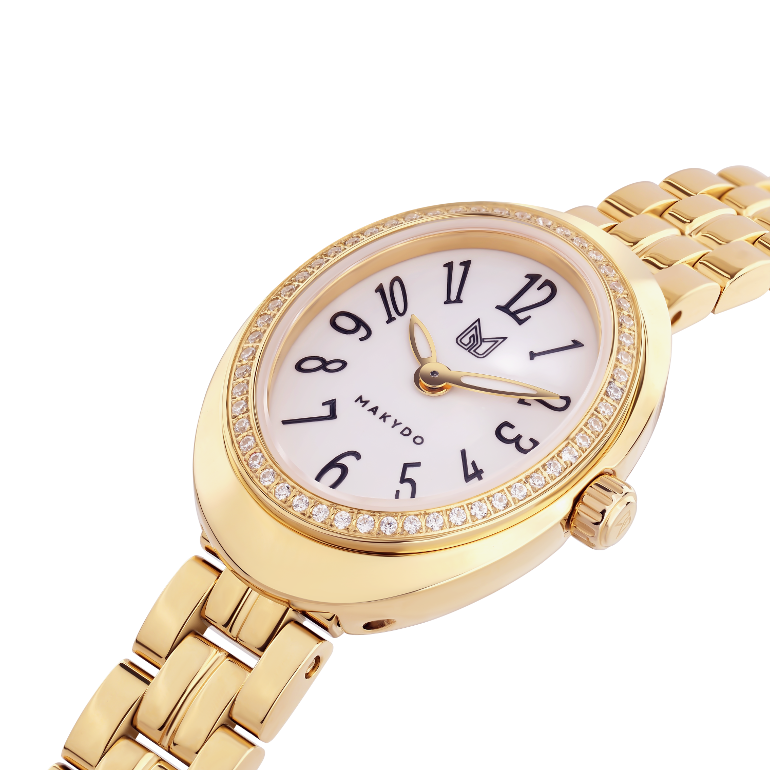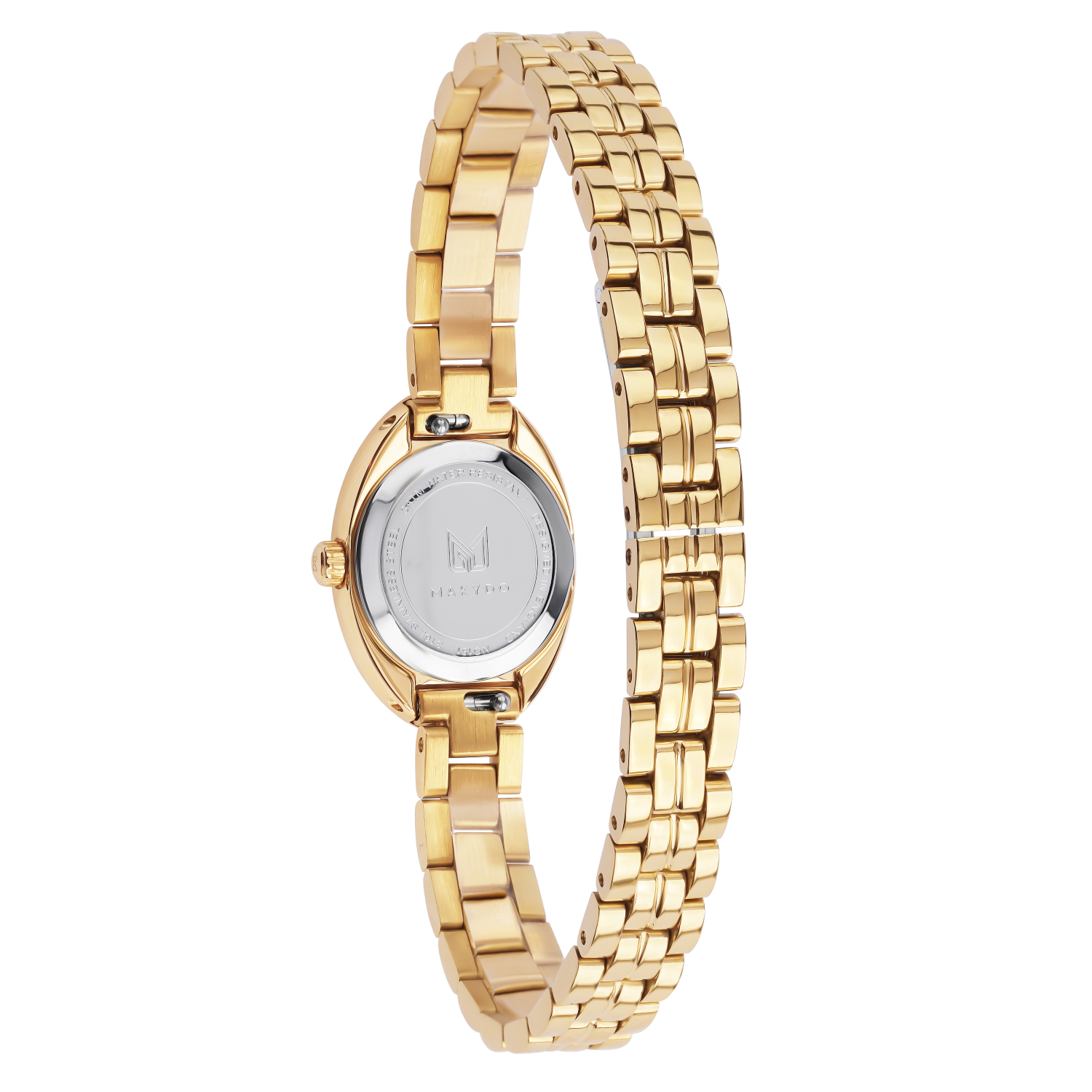 Noor Zenith is an elegant women’s dress watch crowned with a ring of precision-cut premium crystals, selected for their remarkable clarity and light-reflecting brilliance. The slim 27mm oval case in polished gold-tone steel frames a luminous pearlish white dial, creating a silhouette that feels confident yet refined. Crafted from superior 316L stainless steel and protected by sapphire crystal, this slim oval women’s watch unites jewellery-inspired radiance with enduring precision.
